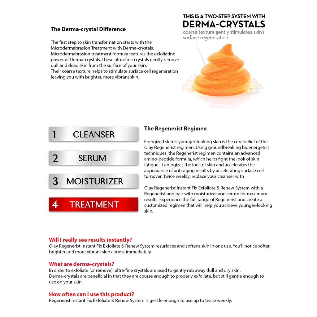 It will help to gently exfoliate and polishes the epidermis surface to offer. Activates surface cell regeneration for softer smoother skin. Enjoy an instant transformation with Olay Regenerist Instant Fix Exfoliate Renew System a duo system that includes a Microdermabrasion Treatment and a Peel Activator Serum.